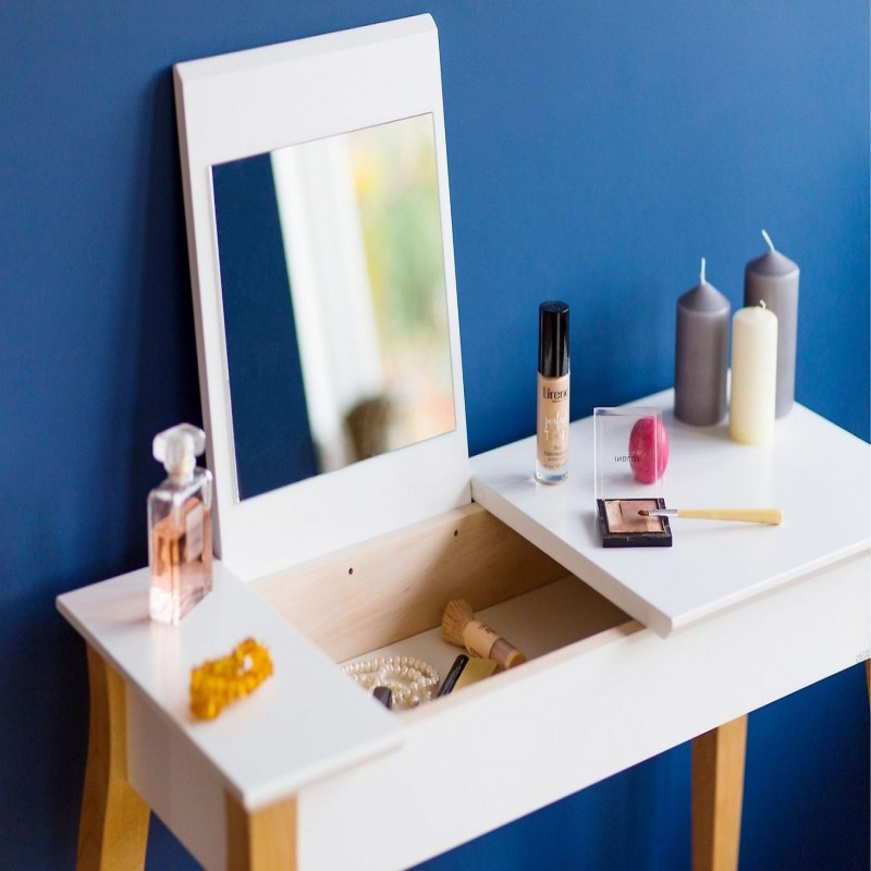 Il tavolo da toeletta è realizzato in legno di faggio e MDF laminato e laccato. Questo lo rende non solo un mobile dal design accattivante, ma anche un prodotto durevole. Le gambe colorate sono rifinite in un elegante colore nero e il piano del tavolo ha uno spessore di 19 mm, conferendogli un aspetto robusto e solido.